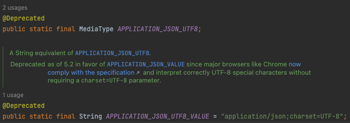 원래는 MediaType.APPLICATION_JSON_UTF8_VALUE 라는 동일한 상수가 존재하지만, deprecated 되었다. ㅠ