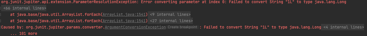 org.junit.jupiter.api.extension.ParameterResolutionException: Error converting parameter at index 0: Failed to convert String "1L" to type java.lang.Long